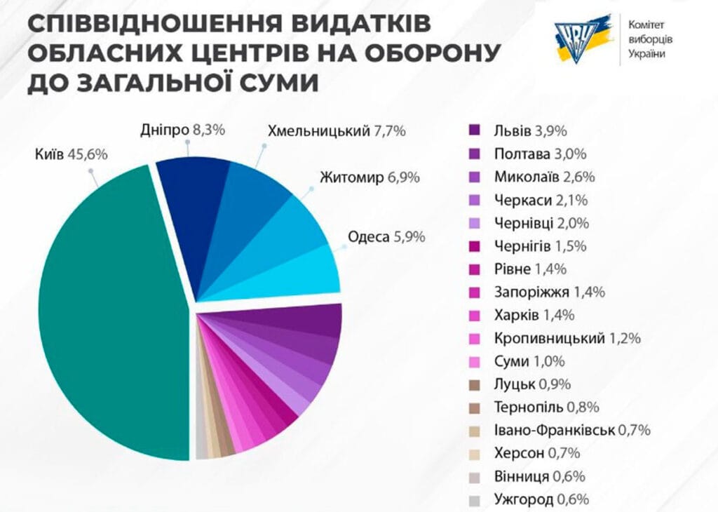 Якщо оцінювати співвідношення видатків обласних центрів на оборону до загальної суми, то лідером тут також є столиця. Частка Києва складає 45,6% спільних витрат обласних центрів.