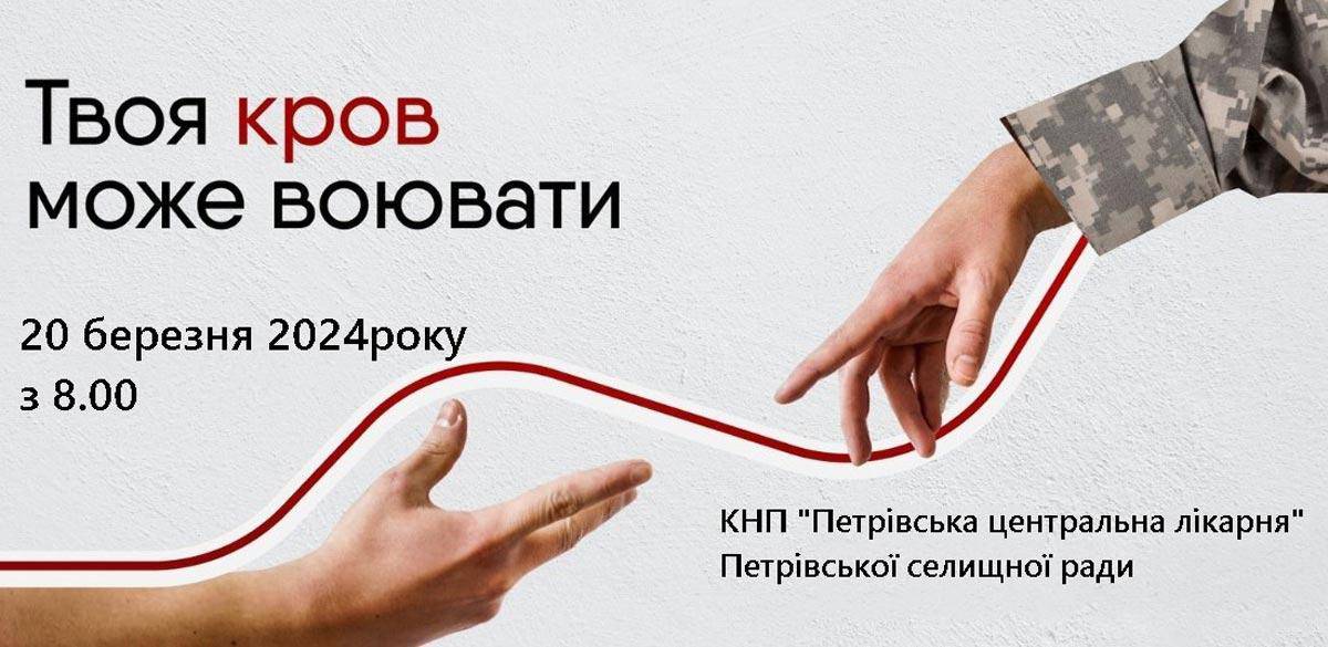 У найближчу середу, 20 березня 2024 року, у селі Петрівка буде проходити донорська акція “Твоя кров може воювати”. Місцеві жителі можуть прийти в лікарню і здати кров для ЗСУ.