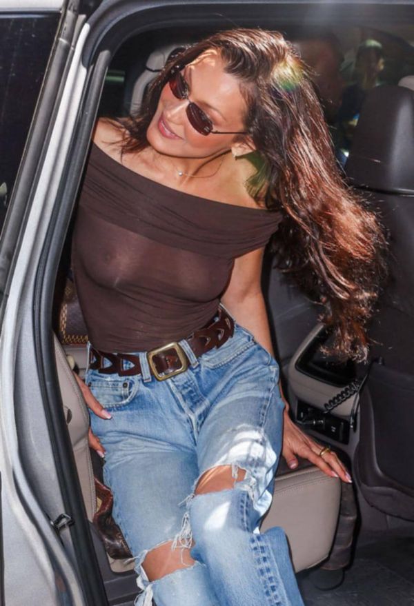 Белла Хадід привернула увагу на вулицях Нью-Йорка, коли вийшла у прозорій коричневій блузці з відкритими плечима. Ця облягаюча блуза підкреслила її струнку фігуру і, голову йдучи, максимально проявила стиль супермоделі, адже бюстгальтер, нагадаємо, був відсутній. Спокусливий образ доповнювали рвані світлі джинси, які виявлялися ідеальним доповненням до контрастного коричневого ременя.