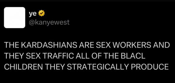 У свіжому пості на платформі Х репер оприлюднив провокаційні звинувачення, назвавши родину Кардаш’ян причетною до «секс-торгівлі» своїми дітьми. Такі висловлювання лише підкреслюють, що Каньє намагається грати роль короля скандалів у світі шоу-бізнесу.