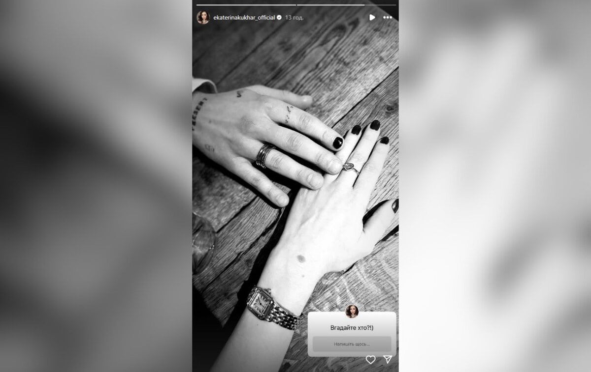 Недавня публікація на Інстаграм-сторінці Катерини залишила безліч запитань серед підписників. Зірка поділилася світлиною, на якій її за руку тримає невідомий чоловік. При цьому у нього можна помітити татуювання та каблучку, а манікюр узагалі точно так само оформлений, як і в самої Кухар.