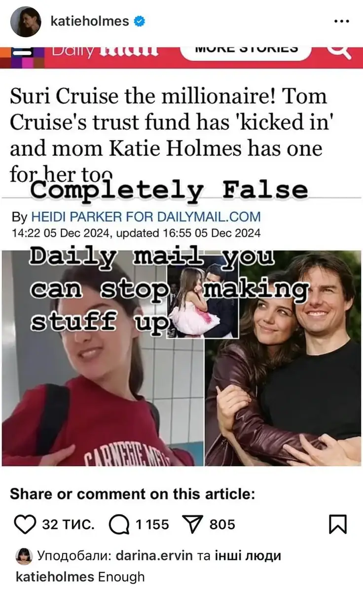 Американська акторка Кеті Холмс, яка зазвичай не коментує чутки щодо стосунків її доньки Сурі з батьком, відомим актором Томом Крузом, вирішила порушити мовчання. У своїй емоційній реакції в Instagram, Холмс відреагувала на публікацію Daily Mail, в якій стверджувалося, що Сурі, досягши 18 років у квітні, стала мільйонеркою завдяки трастовому фонду, створеному її батьком.