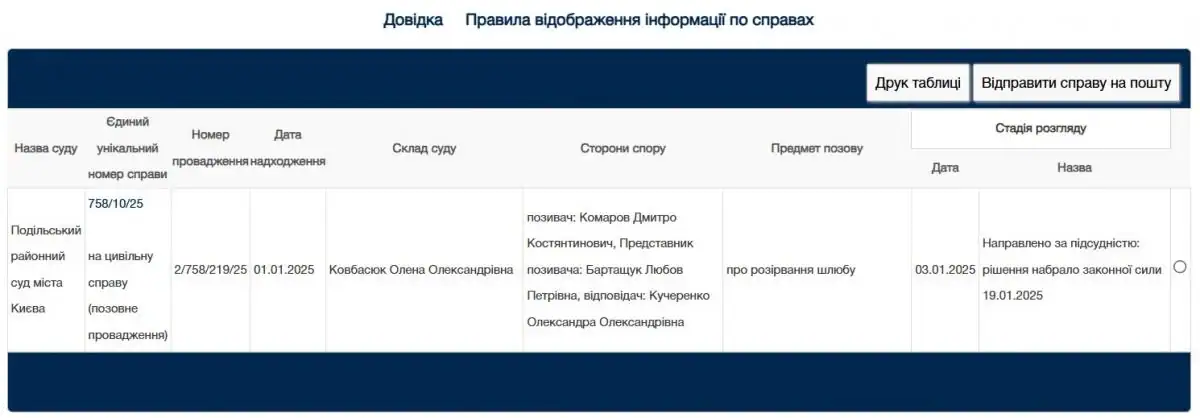 Днями українська громадськість дізналася про розлучення однієї з найромантичніших пар шоу-бізнесу – Дмитра Комарова та Олександри Кучеренко. Ця новина справила враження на фанатів, адже вони здавалося, були прикладом ідеальної пари. Першим про їхнє розлучення повідомив популярний блогер Богдан Беспалов, який оприлюднив документ зі свідченнями про розірвання шлюбу, що набрав чинності 19 січня 2025 року.